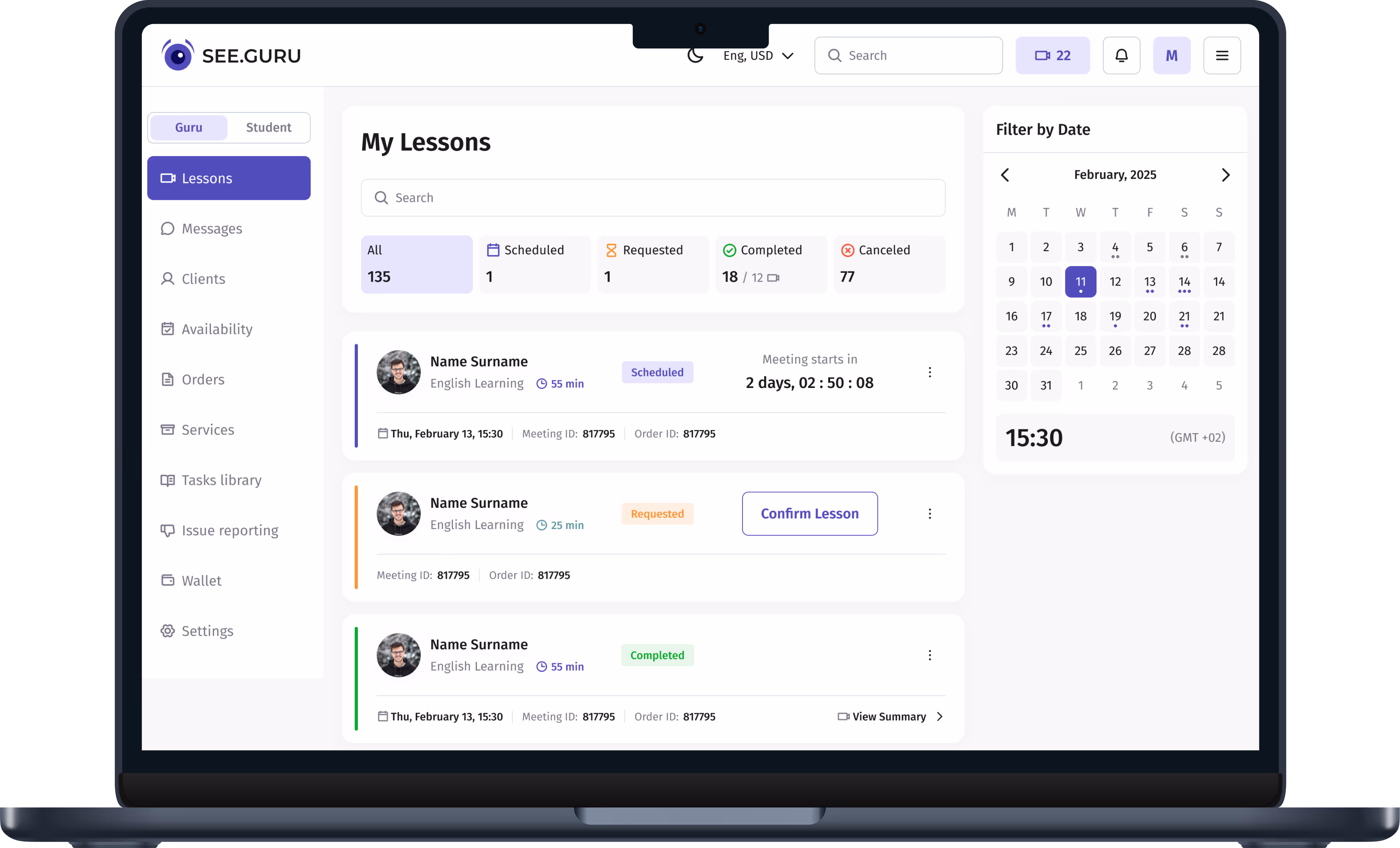 A dual-sided platform that connects language learners with professional tutors. Students can browse available tutors, select course levels, and take lessons directly on the platform with built-in video conferencing. Tutors manage their profiles, respond to student requests, track earnings, and access an integrated dashboard for scheduling and communication.