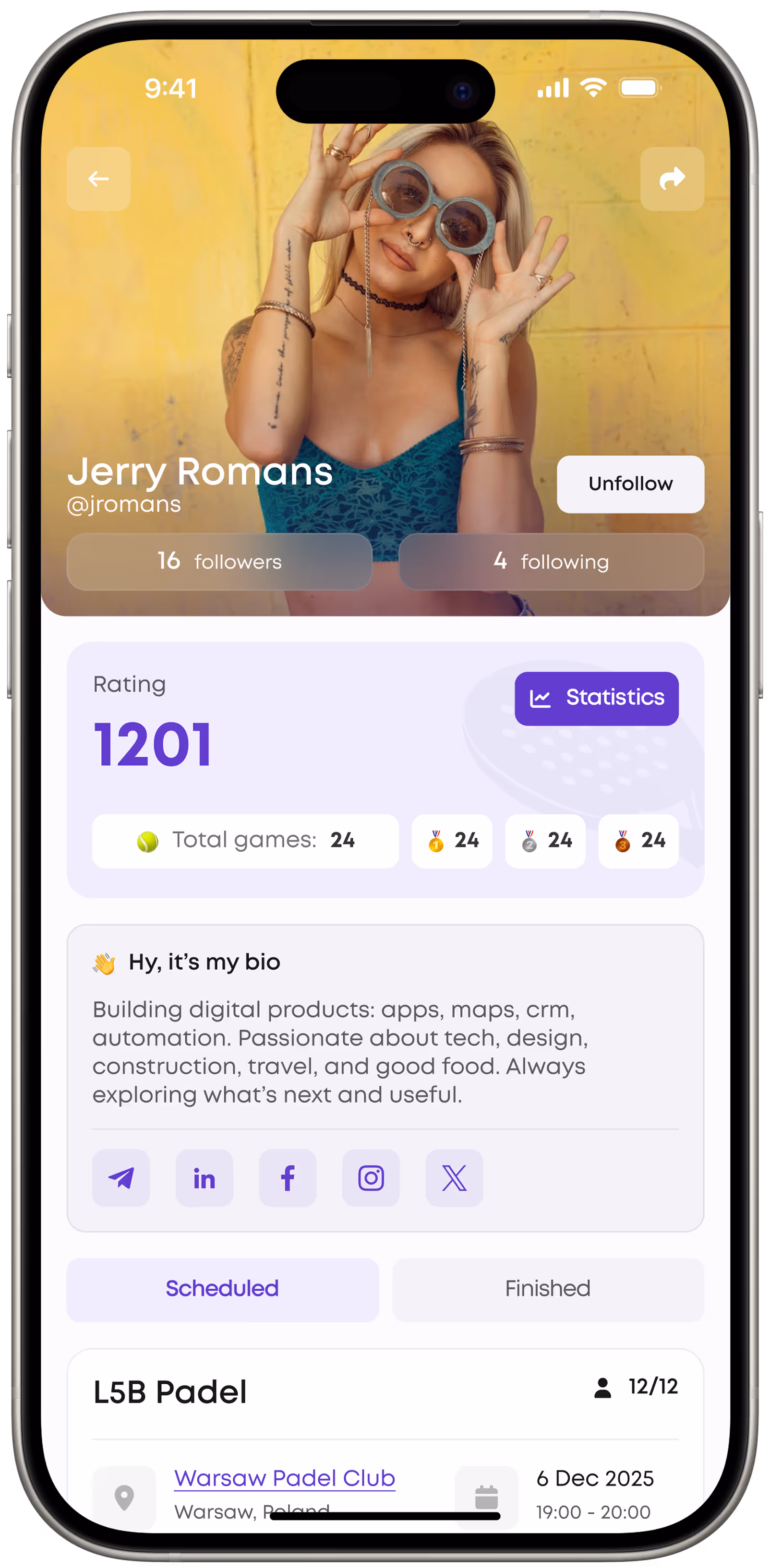 A dynamic mobile app that transforms how padel players connect, compete, and grow.From organizing tournaments and tracking live results to exploring player profiles and rankings — everything is built to enhance the competitive and social experience of the game.