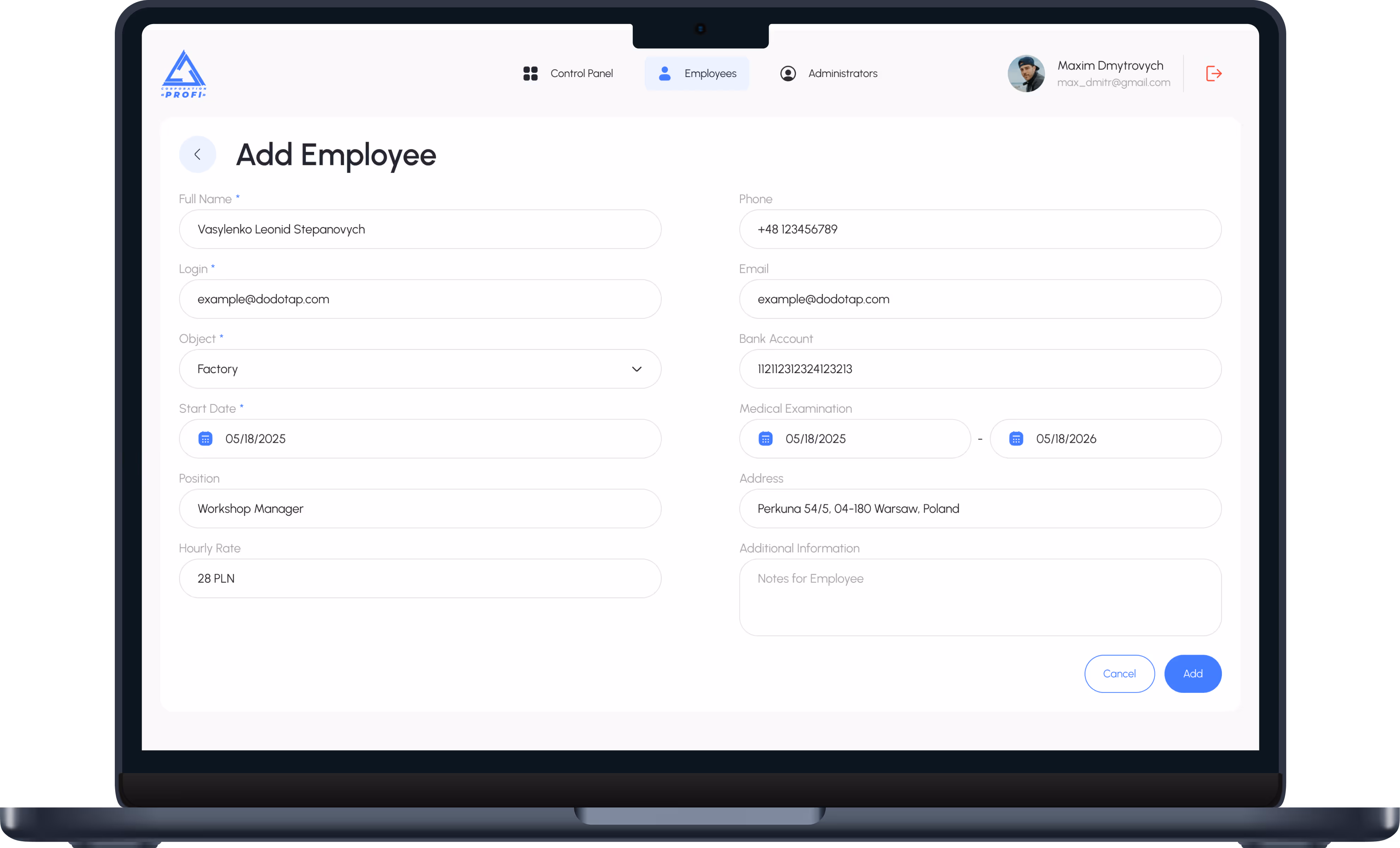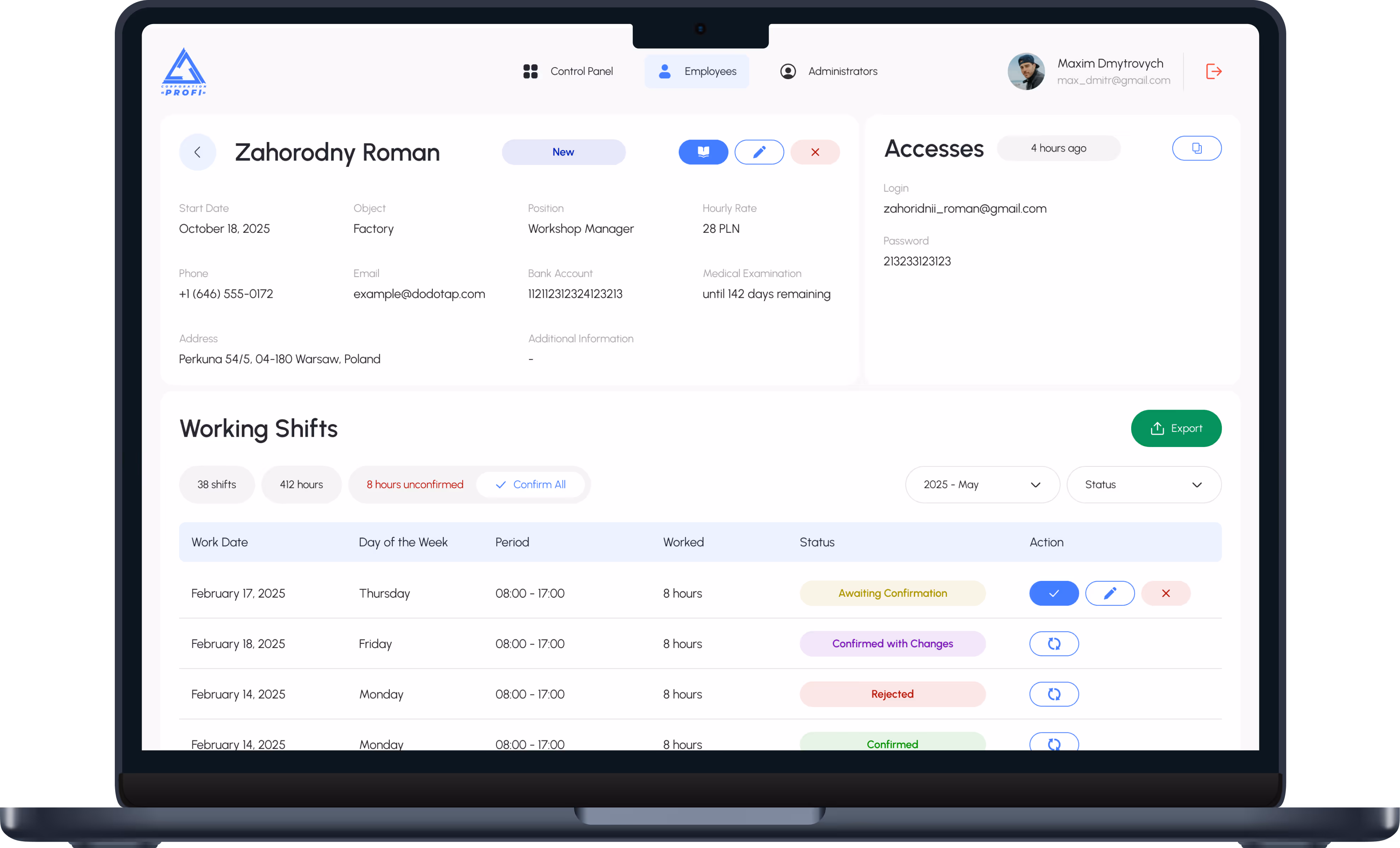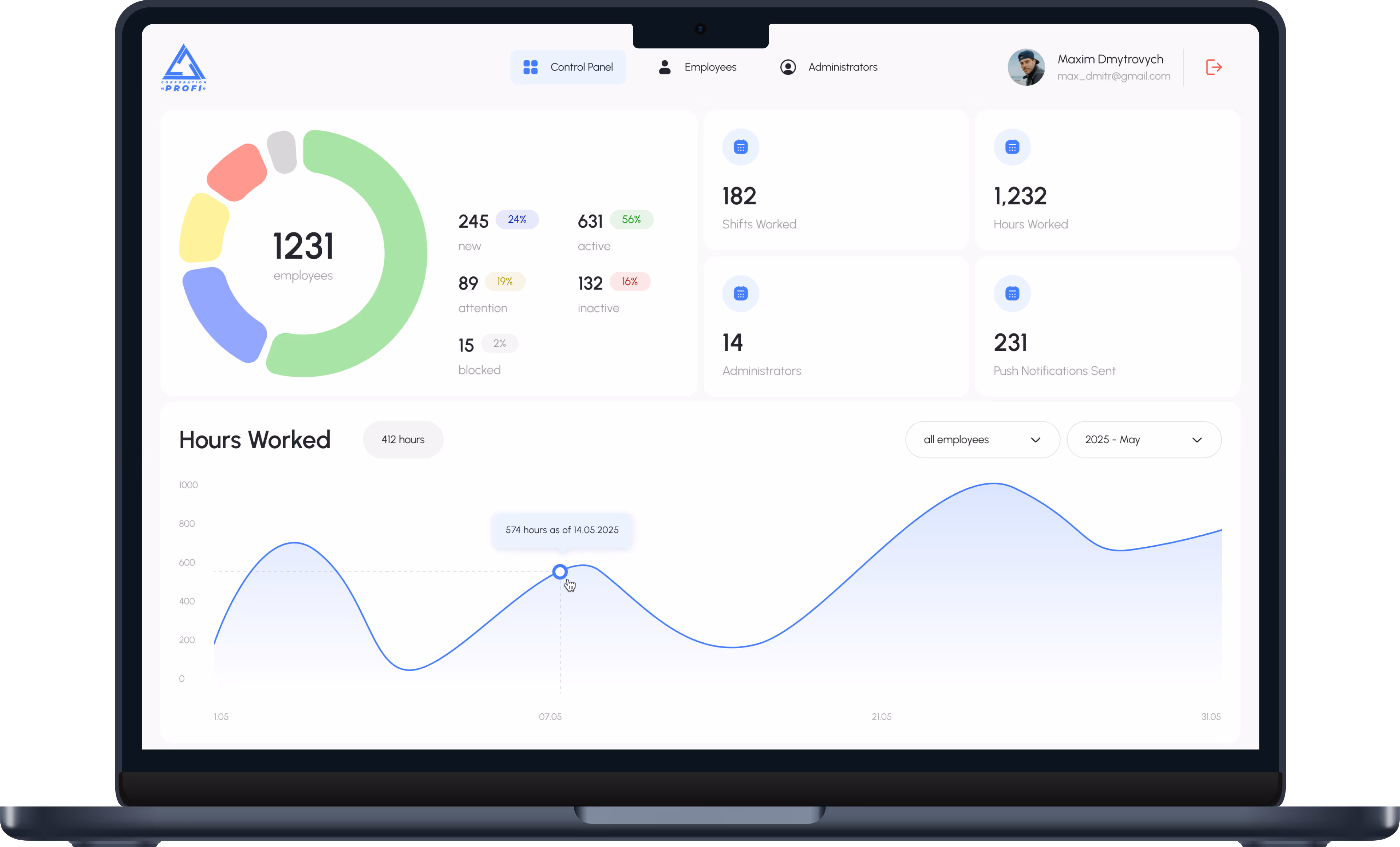 Time-tracking CRM system for managing employee work hours. The platform allows managers to monitor all staff, track hours worked, and view charts by hours and employee status. Employees use a mobile app to log their hours after each shift, which are then submitted for manager approval.
